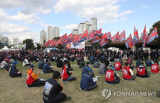 (울산=연합뉴스) 김용태 기자 = 20일 오후 울산시 남구 태화강 둔치에서 민주노총의 총파업 문화제가 열리고 있다. 2021.10.20
