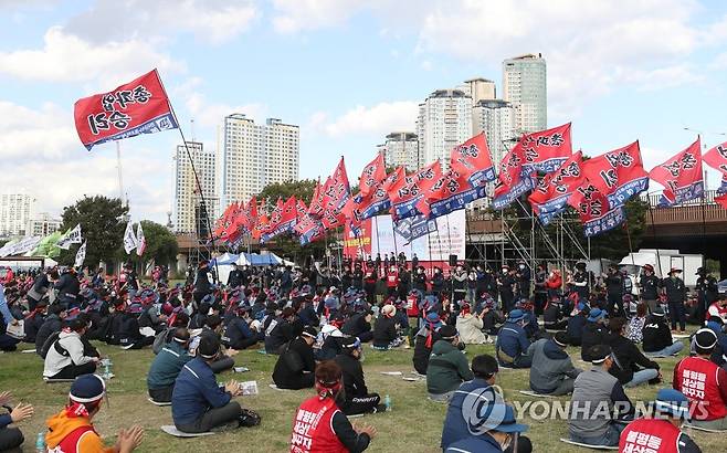 (울산=연합뉴스) 김용태 기자 = 20일 오후 울산시 남구 태화강 둔치에서 민주노총의 총파업 문화제가 열리고 있다. 2021.10.20
