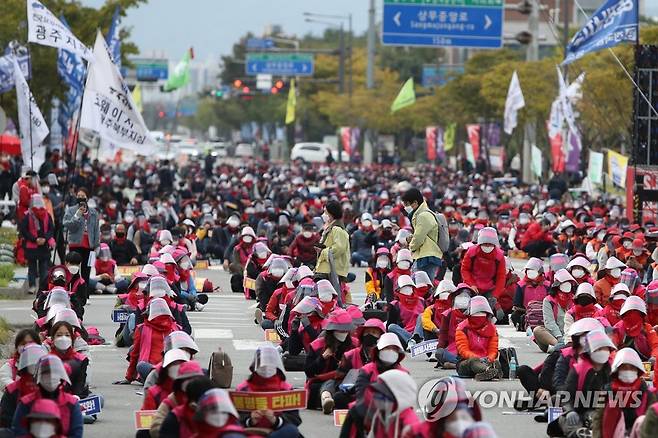 (광주=연합뉴스) 정회성 기자 = 20일 오후 광주 서구 치평동 도심에서 민주노총 광주본부가 주최한 '1020 총파업대회'에서 연노란색 민방위복을 입은 방역 공무원이 집회 참가자 틈에서 이동하고 있다. 2021.10.20