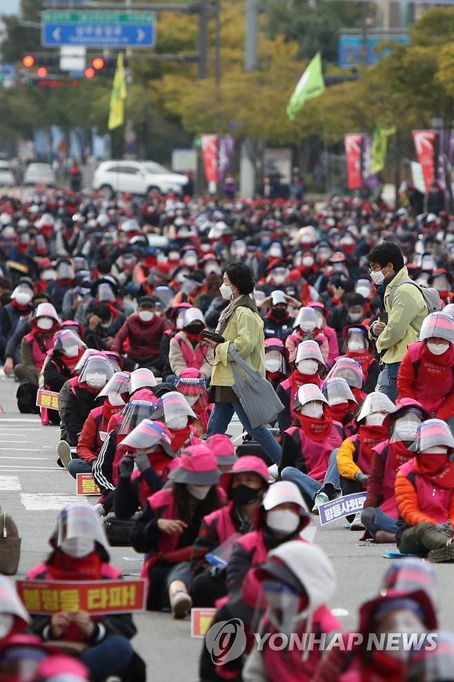 (광주=연합뉴스) 정회성 기자 = 20일 오후 광주 서구 치평동 도심에서 민주노총 광주본부가 주최한 '1020 총파업대회'에서 연노란색 민방위복을 입은 방역 공무원이 집회 참가자 틈에서 이동하고 있다. 2021.10.20