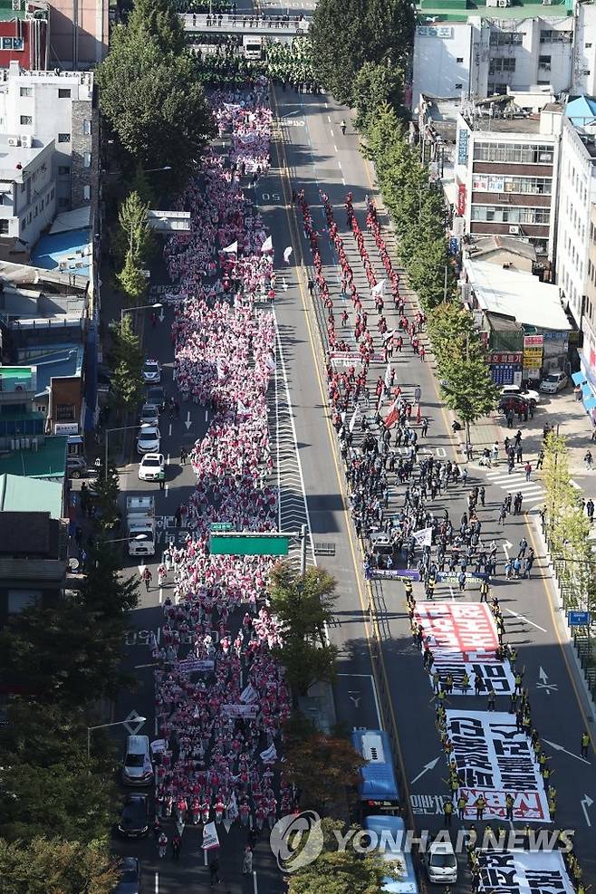 (서울=연합뉴스) 윤동진 기자 = 10·20 민주노총 총파업에 참가한 조합원들이 20일 서울 서대문역 인근에 기습 집결해 도로를 점거한 채 집회를 하고 있다. 2021.10.20 [공동취재]