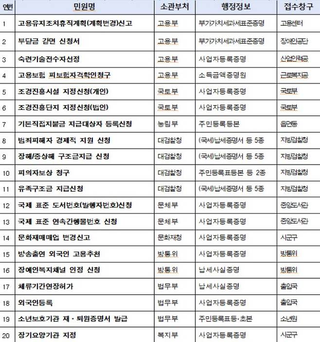 행정안전부는 민원인이 요구할 경우 민원 처리 과정에서 본인에 관한 행정정보를 공동이용해 구비서류 발급·제출이 필요 없도록 개정한 민원처리법 및 시행령이 21일부터 시행된다고 20일 밝혔다.