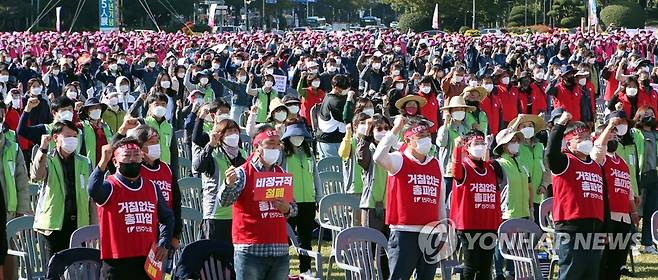 (창원=연합뉴스) 한지은 기자 = 민주노총 경남본부가 20일 오후 경남 창원시 성산구 창원광장에서 총파업대회를 열고 있다.