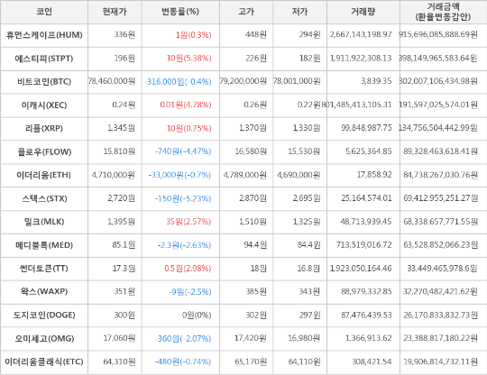 한편 거래금액 기준으로는 휴먼스케이프, 에스티피, 비트코인 순으로 가장 활발한 거래를 보이고 있다.