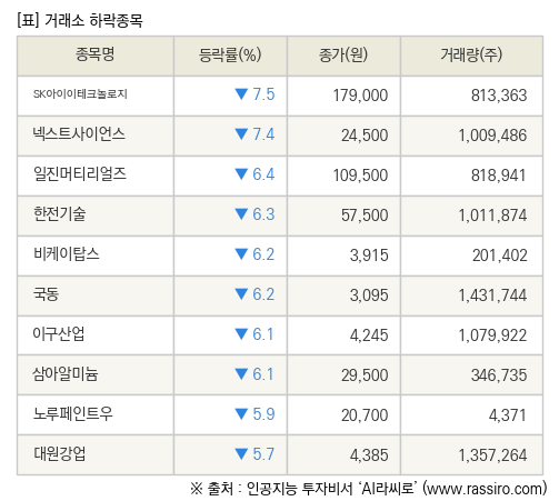 [fnRASSI]장마감, 거래소 하락 종목(SK아이이테크놀로지 -7.5% ↓)
