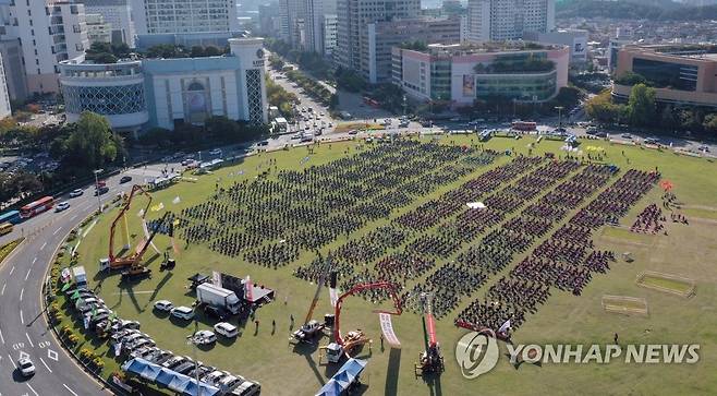 이날 대회에는 총 2천800여 명(경찰 추산)이 참석했고, 참석자들은 50인 이상 집회·시위가 금지된 방역 지침에 따라 49개씩 구획을 나눠 배치했다. 2021.10.20