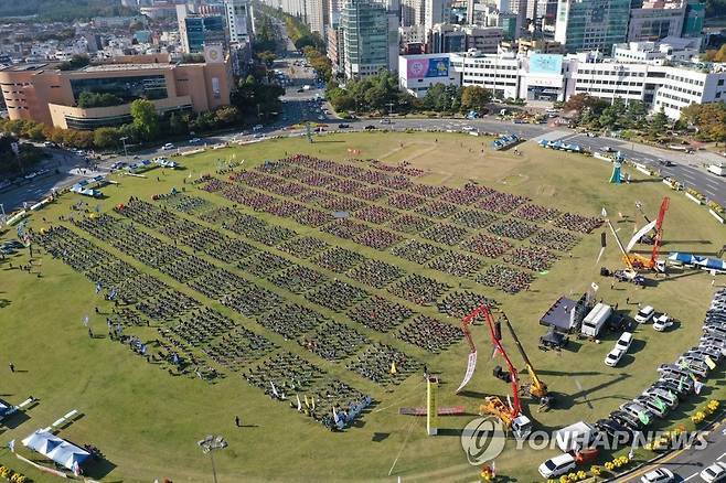 이날 대회에는 총 2천800여 명(경찰 추산)이 참석했고, 참석자들은 50인 이상 집회·시위가 금지된 방역 지침에 따라 49개씩 구획을 나눠 배치했다. 2021.10.20