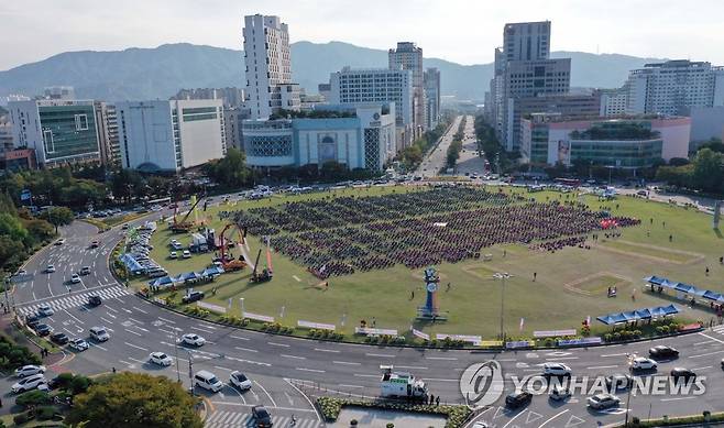 이날 대회에는 총 2천800여 명(경찰 추산)이 참석했고, 참석자들은 50인 이상 집회·시위가 금지된 방역 지침에 따라 49개씩 구획을 나눠 배치했다. 2021.10.20