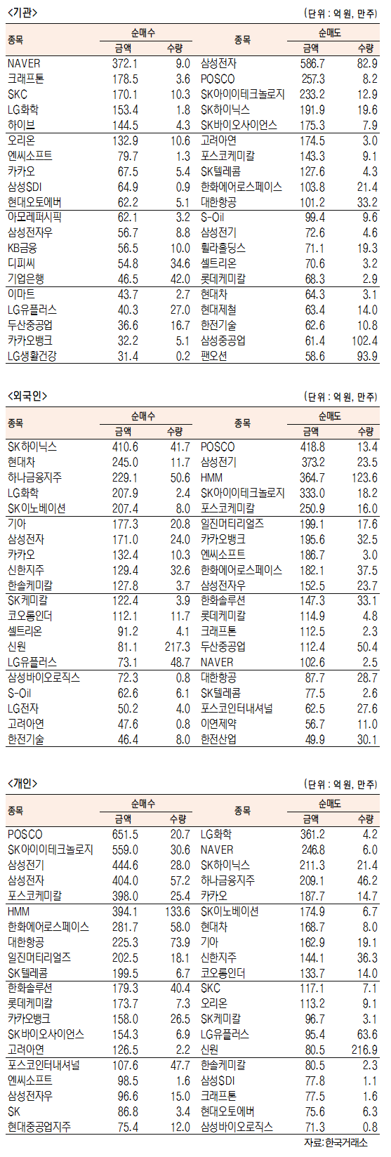 [표]유가증권 기관·외국인·개인 순매수·도 상위종목(10월 20일)