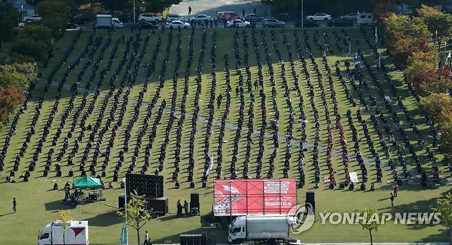 (대전=연합뉴스) 김준범 기자 = 민주노총 대전본부 노조원 2천여명이 20일 오후 대전시 서구 탄방동 보라매공원에서 '5인 미만 사업장 차별 철폐·비정규직 철폐, 모든 노동자의 노조 활동 권리 쟁취' 등을 주장하며 집회를 하고 있다. 2021.10.20