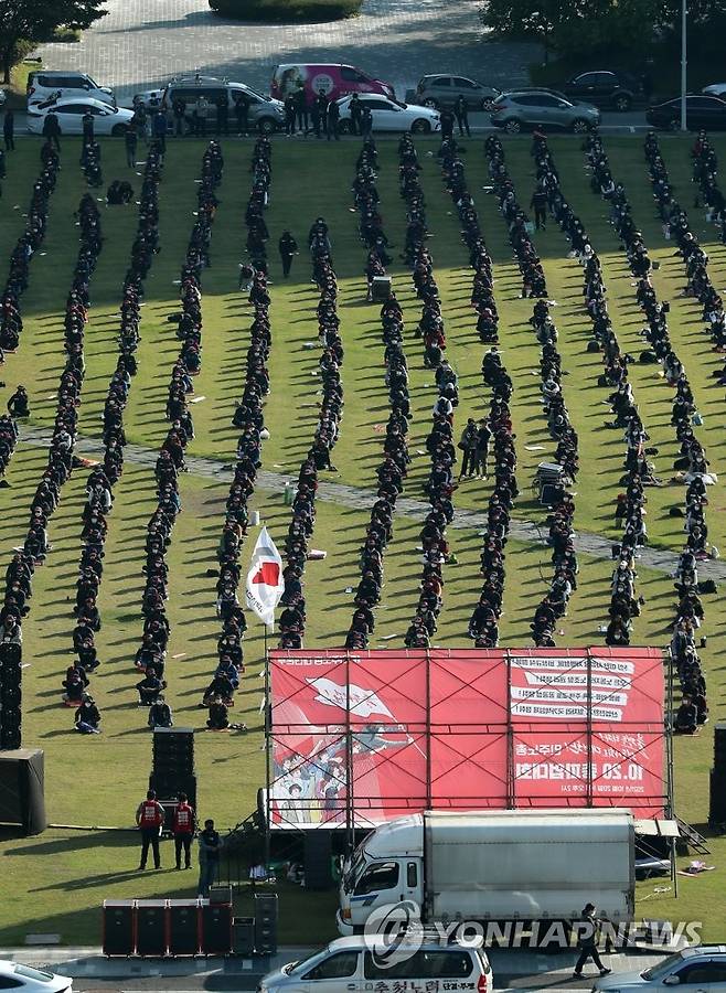 (대전=연합뉴스) 김준범 기자 = 민주노총 대전본부 노조원 2천여명이 20일 오후 대전시 서구 탄방동 보라매공원에서 '5인 미만 사업장 차별 철폐·비정규직 철폐, 모든 노동자의 노조 활동 권리 쟁취' 등을 주장하며 집회를 하고 있다. 2021.10.20