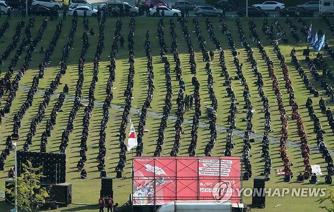 (대전=연합뉴스) 김준범 기자 = 민주노총 대전본부 노조원 2천여명이 20일 오후 대전시 서구 탄방동 보라매공원에서 '5인 미만 사업장 차별 철폐·비정규직 철폐, 모든 노동자의 노조 활동 권리 쟁취' 등을 주장하며 집회를 하고 있다. 2021.10.20