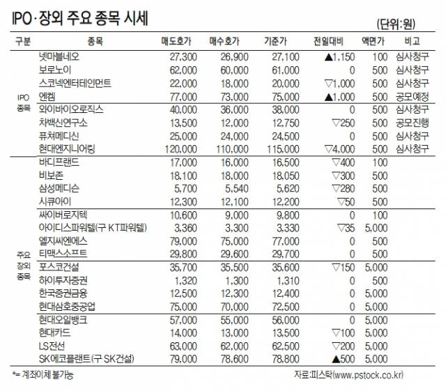 [표]IPO장외 주요 종목 시세(10월 20일)