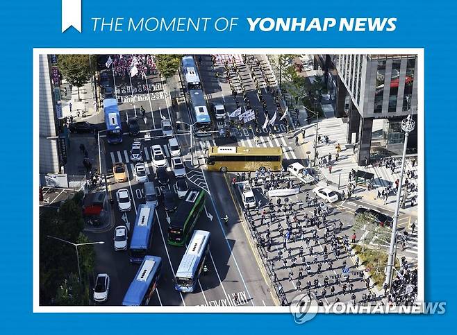 (서울=연합뉴스) 윤동진 기자 = 10·20 민주노총 총파업에 참가한 조합원들이 20일 서울 서대문역 네거리에 기습 집결해 집회를 하자 교통 혼잡이 빚어지고 있다. 2021.10.20 [THE MOMENT OF YONHAPNEWS]