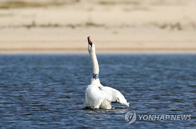 예전보다 이른 시기에 관찰된 이 혹고니의 목에는 커다란 인식표가 부착돼 있다. 2021.10.20