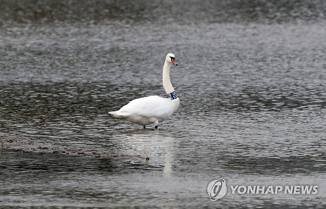 예전보다 이른 시기에 관찰된 이 혹고니의 목에는 커다란 인식표가 부착돼 있다. 2021.10.20