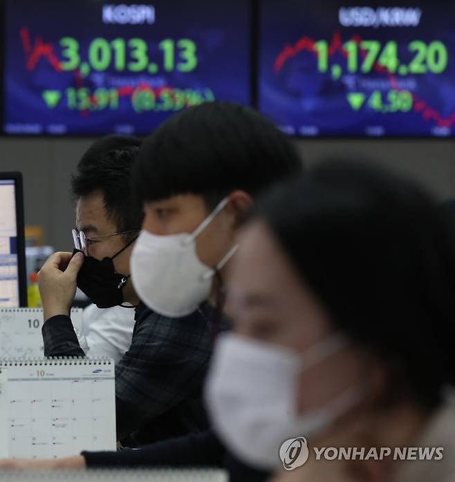 이날 코스피는 전 거래일보다 15.91포인트(0.53%) 내린 3,013.13에 거래를 마쳤다. 2021.10.20