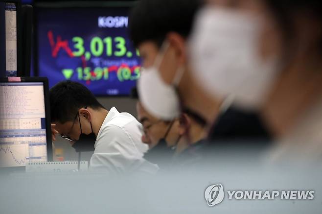 (서울=연합뉴스) 박동주 기자 = 코스피가 하락 마감한 20일 오후 서울 중구 하나은행 딜링룸에서 직원들이 업무를 보고 있다.