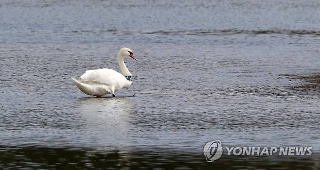 (강릉=연합뉴스) 유형재 기자 = 20일 오후 강원 강릉시 한 하천에서 천연기념물(제201-3호)이자 멸종위기 야생생물 1급으로 지정돼 보호받고 있는 혹고니 1마리가 외로이 노닐고 있다.