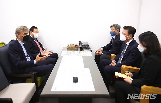 [제주=뉴시스] 우장호 기자 = 20일 오후 제주도청 2층 도지사권한대행실에서 후안 이그나시오 모로(왼쪽) 주한 스페인대사와 구만섭(오른쪽 가운데) 제주도지사권한대행이 면담하고 있다. 이날 면담은 지난 6월 문재인 대통령의 스페인 순방 당시 한국과 스페인 간 관광교류 활성화 일환으로, 스페인 '산티아고 순례길'과 한국 '제주 올레길'에 상호 상징구간을 만들기로 논의한 데 따른 후속 조치다. 2021.10.20. woo1223@newsis.com