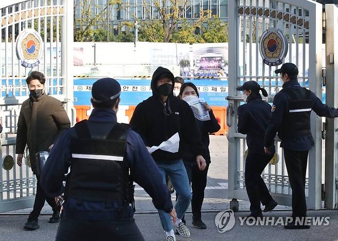 (서울=연합뉴스) 백승렬 기자 = 20일 서울 종로구 정부서울청사에서 열린 관·경 대테러 합동훈련에서 경찰특공대, 청원경찰 등이 무단침입 대응 훈련을 하고 있다. 이번 훈련은 정부청사 시설 안전점검 및 위기대응태세를 확립하고 재난 대응 기능을 강화하기 위해 열렸다. 2021.10.20