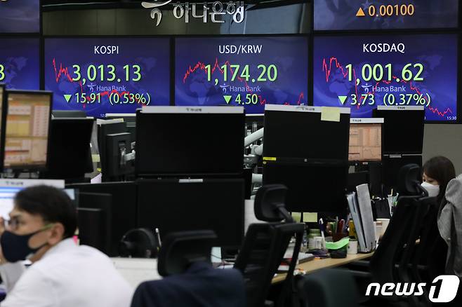 (서울=뉴스1) 이승배 기자 = 20일 오후 서울 중구 하나은행 명동점 딜링룸 전광판의 코스피 지수가 전 거래일 대비 15.91p(0.53%) 내린 3,013.13을 나타내고 있다.