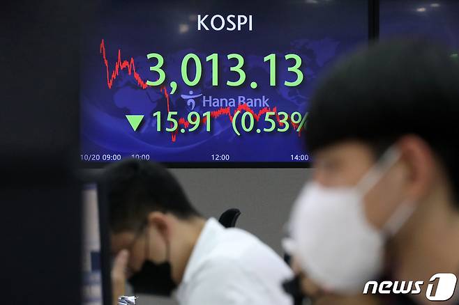 (서울=뉴스1) 이승배 기자 = 20일 오후 서울 중구 하나은행 명동점 딜링룸 전광판의 코스피 지수가 전 거래일 대비 15.91p(0.53%) 내린 3,013.13을 나타내고 있다.
