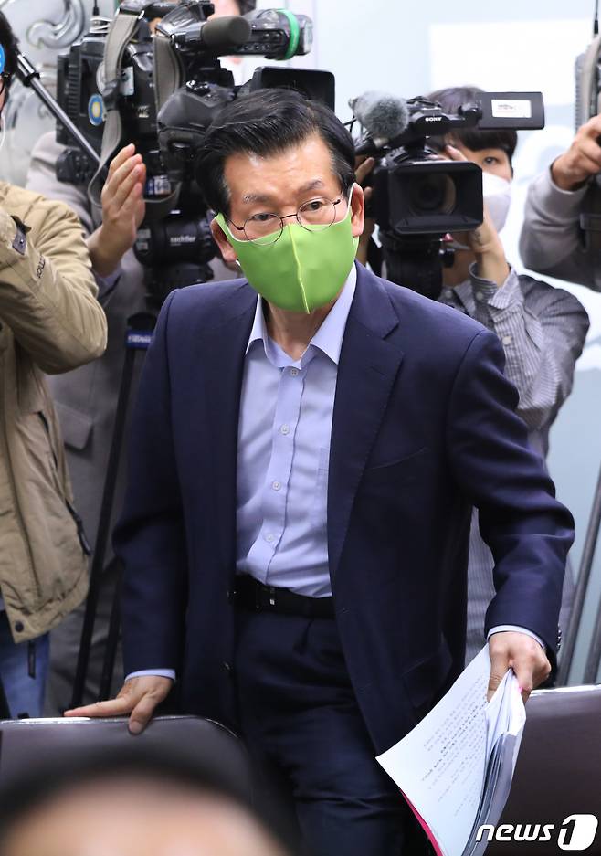 (성남=뉴스1) 김영운 기자 = 20일 오후 경기도 성남시 수정구 법무법인 디지털 사무실에서 장영하 변호사가 기자회견을 하기 위해 입장하고 있다. 2021.10.20/뉴스1