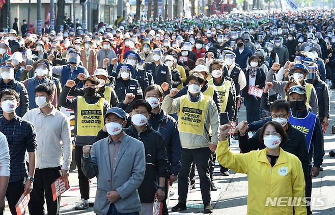 [대구=뉴시스] 이무열 기자 = 민주노총 대구지역본부 1020 총파업 대회가 열린 20일 오후 대구 중구 봉산가구거리 일원에서 참가자들이 ‘불평등OUT’ 구호를 외치고 있다. 2021.10.20. lmy@newsis.com