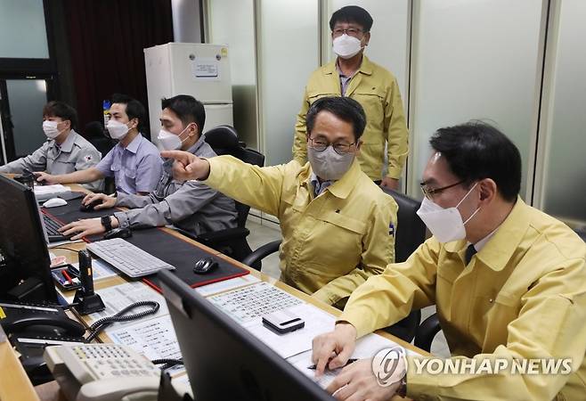 (서울=연합뉴스) 백승렬 기자 = 20일 서울 종로구 정부서울청사 통합상황실에서 박일웅 행정안전부 서울청사관리소장과 최승환 관리과장이 재난대응 안전한국훈련을 지휘하고 있다. 이번 훈련은 정부청사 시설 안전점검 및 위기대응태세를 확립하고 재난 대응 기능을 강화하기 위해 열렸다. 2021.10.20