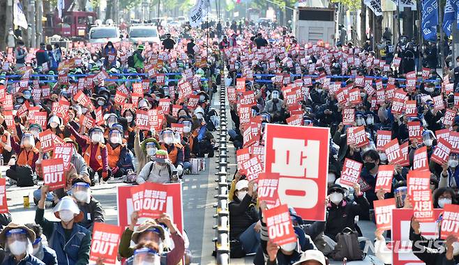 [대구=뉴시스] 이무열 기자 = 민주노총 대구지역본부 1020 총파업 대회가 열린 20일 오후 대구 중구 봉산가구거리 일원에서 참가자들이 ‘불평등OUT’ 구호를 외치고 있다. 2021.10.20. lmy@newsis.com