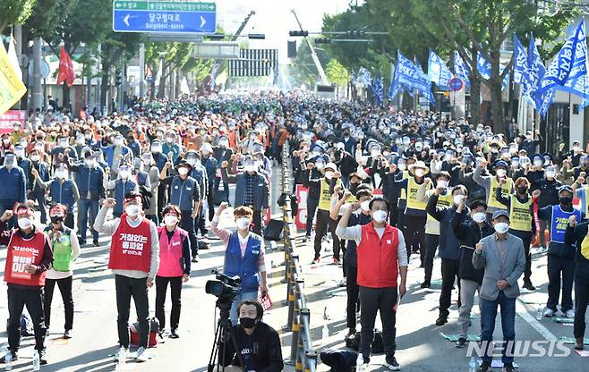[대구=뉴시스] 이무열 기자 = 민주노총 대구지역본부 1020 총파업 대회가 열린 20일 오후 대구 중구 봉산가구거리 일원에서 참가자들이 ‘불평등OUT’ 구호를 외치고 있다. 2021.10.20. lmy@newsis.com