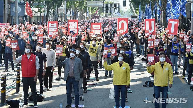 [대구=뉴시스] 이무열 기자 = 민주노총 대구지역본부 1020 총파업 대회가 열린 20일 오후 대구 중구 봉산가구거리 일원에서 참가자들이 ‘불평등OUT’ 구호를 외치고 있다. 2021.10.20. lmy@newsis.com