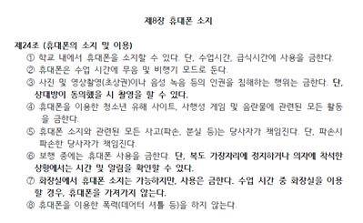 | ▲ 휴대폰소지 조항 봉명중학교 학생생활규정 중 휴대폰 소지 조항 |