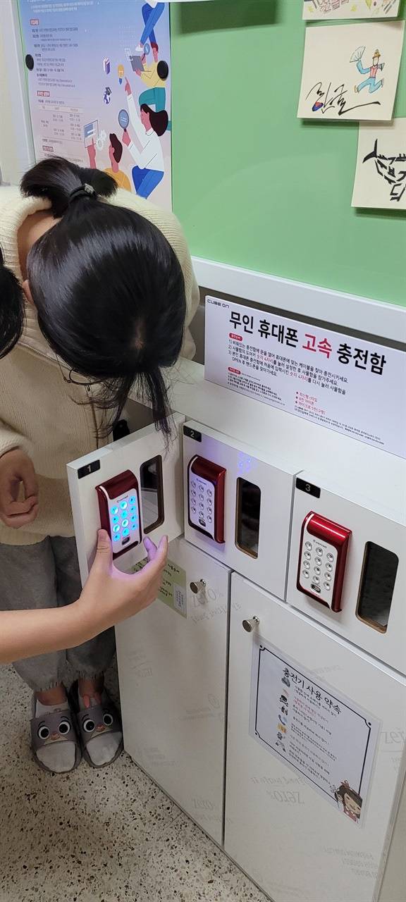 | ▲ 휴대폰 충전함 각 학년 복도에 설치됨(3군데) |
