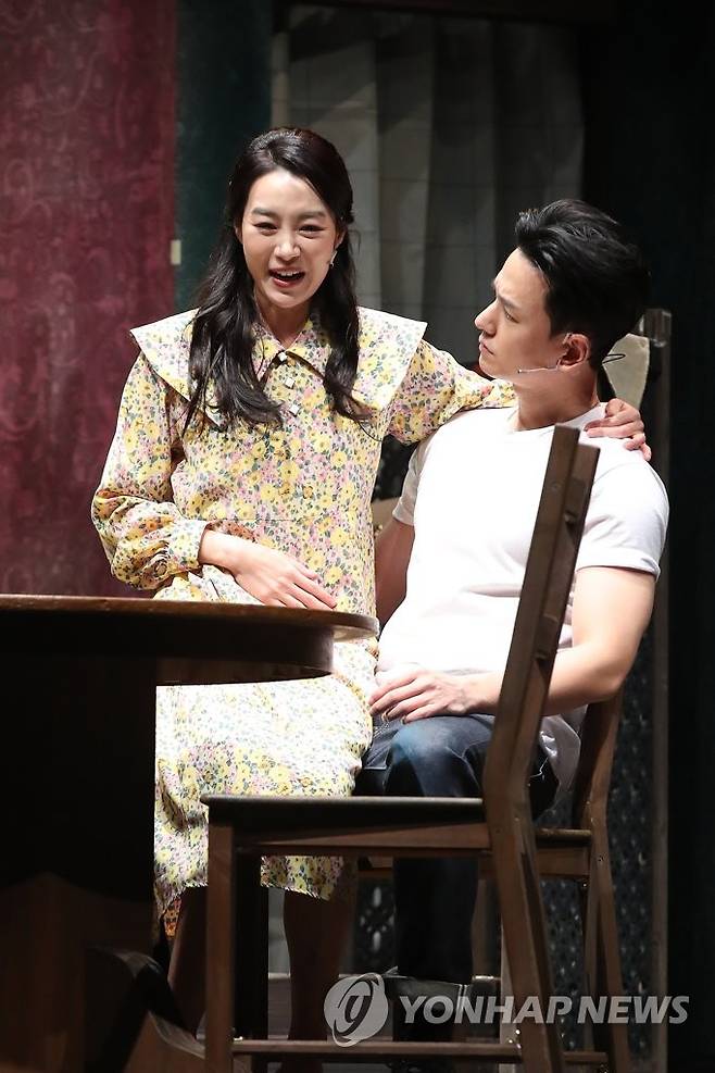 (서울=연합뉴스) 강민지 기자 = 20일 오후 서울 종로구 홍익대 대학로 아트센터 대극장에서 열린 연극'욕망이라는 이름의 전차'프레스콜에서 배우 임주환(오른쪽), 배정화가 하이라이트 시연을 하고 있다. 2021.10.20