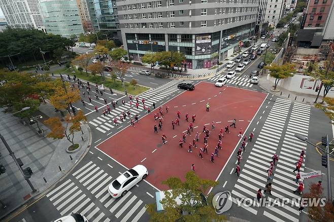 (광주=연합뉴스) 정회성 기자 = 20일 오후 광주 서구 치평동 도심에서 '1020 총파업대회'에 참가한 민주노총 광주본부 조합원들이 행진하고 있다. 2021.10.20