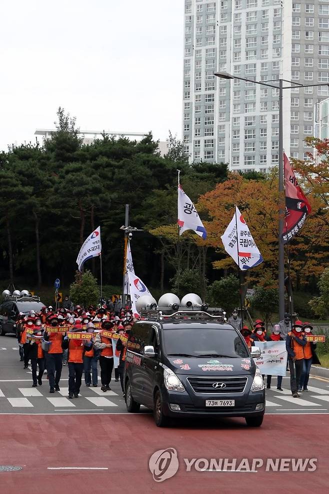 (광주=연합뉴스) 정회성 기자 = 20일 오후 광주 서구 치평동 도심에서 '1020 총파업대회'에 참가한 민주노총 광주본부 조합원들이 행진하고 있다. 2021.10.20