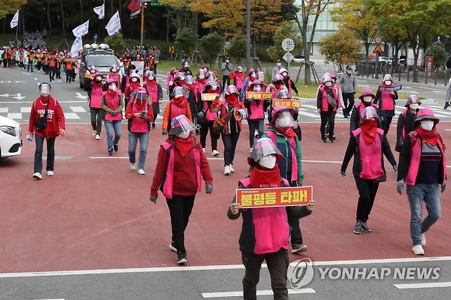 (광주=연합뉴스) 정회성 기자 = 20일 오후 광주 서구 치평동 도심에서 '1020 총파업대회'에 참가한 민주노총 광주본부 조합원들이 행진하고 있다. 2021.10.20