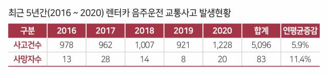 또 렌터카 음주운전 교통사고 발생건수는 연평균 5.9%, 사망자수는 연평균 11.4% 증가세를 보였고, 연령대별로는 21~30세 운전자 사고 비율이 32.2%, 사망자 비율이 53.0%에 달했다.