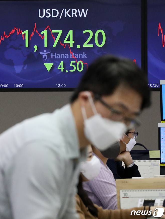 (서울=뉴스1) 이승배 기자 = 20일 오후 서울 중구 하나은행 명동점 딜링룸 전광판의 원·달러 환율이 전 거래일 대비 4.5원 내린 1,174.2원을 나타내고 있다.