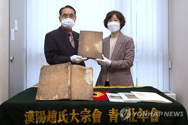(서울=연합뉴스) 20일 서울 종로구에서 국립중앙도서관 관계자가 한양조씨대종회 부회장 조병국 씨(양절공파, 왼쪽)로부터 17세기에 간행된 '한양조씨족보' 1종 3책을 기증받은 뒤 기념 촬영을 하고 있다. 2021.10.20
