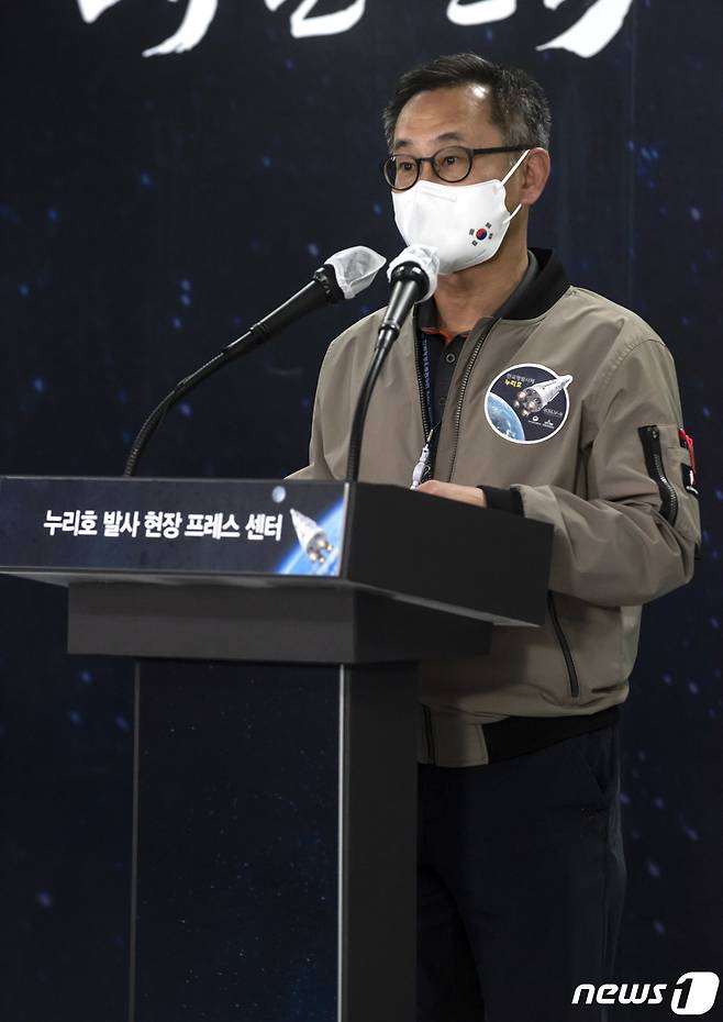 (서울=뉴스1) = 오승협 한국항공우주연구원 발사체추진기관개발부장이 20일 전남 고흥군 나로우주센터 프레스센터에서 한국형 우주발사체 '누리호' 관련 브리핑을 하고 있다.