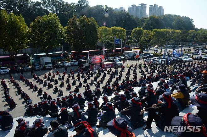 [청주=뉴시스] 조성현 기자 = 20일 오후 충북 청주시 서원구 실내체육관 앞에서 1000여명의 인원이 참석한 민주노총 충북본부의 총파업 대회가 열리고 있다. 2021.10.20. jsh0128@newsis.com