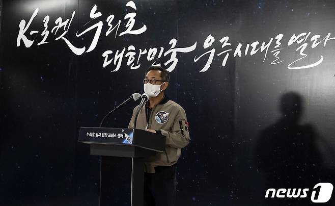 (서울=뉴스1) = 오승협 한국항공우주연구원 발사체추진기관개발부장이 20일 전남 고흥군 나로우주센터 프레스센터에서 한국형 우주발사체 '누리호' 관련 브리핑을 하고 있다.