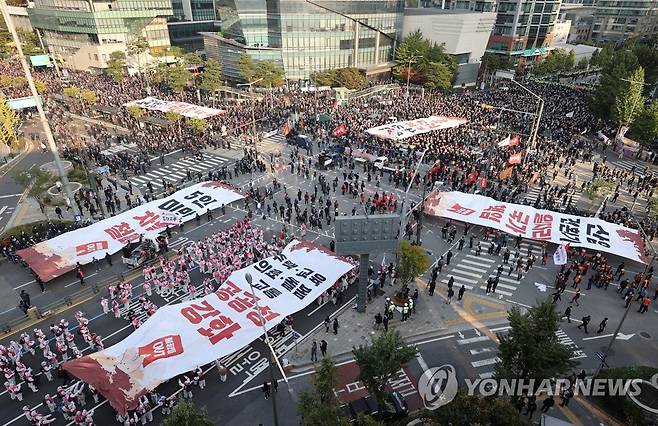 (서울=연합뉴스) 윤동진 기자 = 10·20 민주노총 총파업에 참가한 조합원들이 20일 서울 서대문역 사거리에서 '5인 미만 사업장 차별 철폐·비정규직 철폐, 모든 노동자의 노조활동 권리 쟁취' 등을 주장하며 대형 현수막을 펼치며 퍼포먼스를 벌이고 있다. 2021.10.20