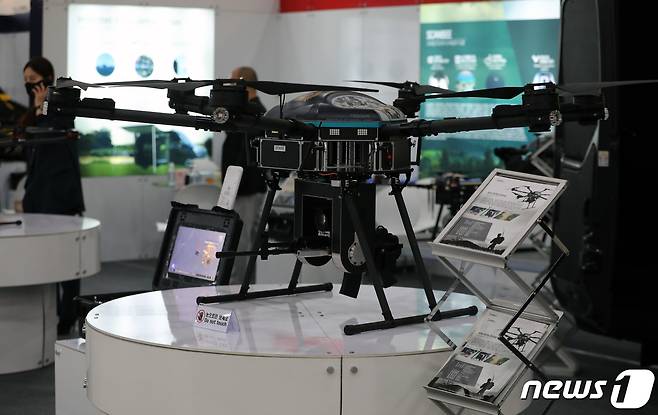 (인천=뉴스1) 정진욱 기자 = 20일 오후 인천시 연수구 송도컨벤시아에서 열린 2021 국제치안산업박람회에서 소총 조준사격 드론이 전시돼 있다. 이 드론에는 K2소총이 장착돼 상황 발생시 목표물을 명중시킬 수 있다. 2021.10.20/뉴스1