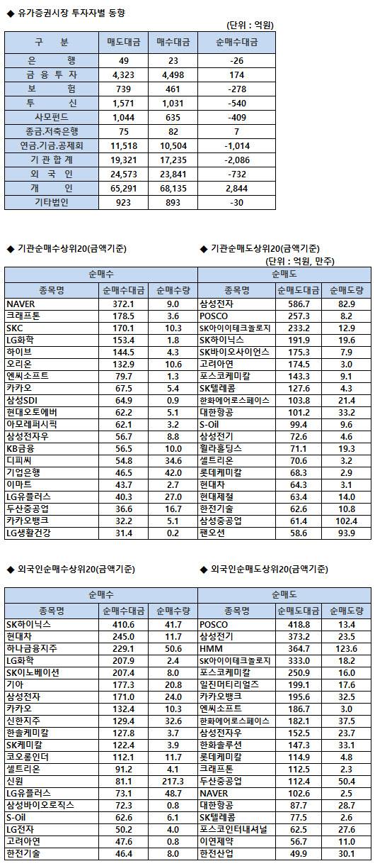 [표]코스피 기관/외국인 매매동향(10/20 3시30분)