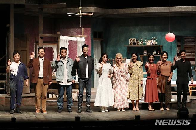 [서울=뉴시스] 박진희 기자 = 연극 '욕망이라는 이름의 전차' 출연 배우들이 20일 서울 종로구 홍익대 대학로 아트센터 대극장에서 프레스콜을 마치고 무대인사를 하고 있다. 2021.10.20. pak7130@newsis.com