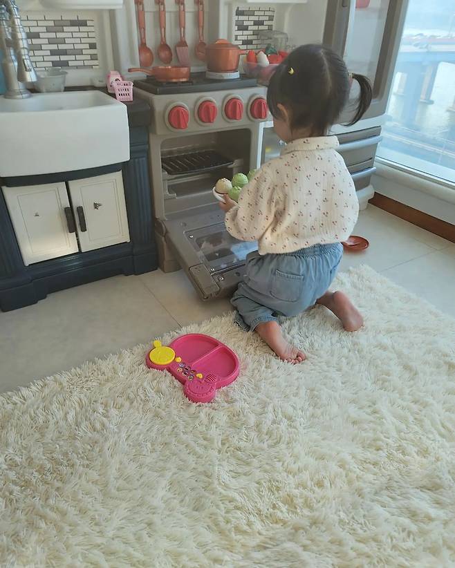 공개된 사진 속에는 장난감 모형 오븐 앞에서 부엌 놀이 중인 태리 양의 모습이 담겨있다. 아빠와 함께 부엌 놀이를 즐기는 태리 양의 폭풍 성장 근황이 눈길을 끈다.